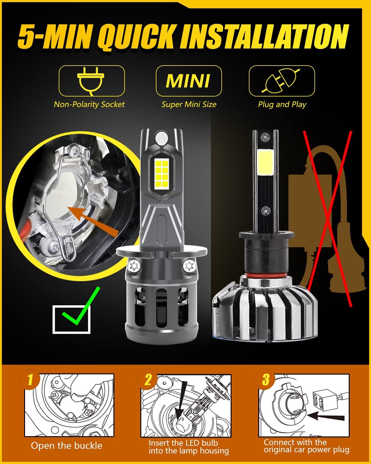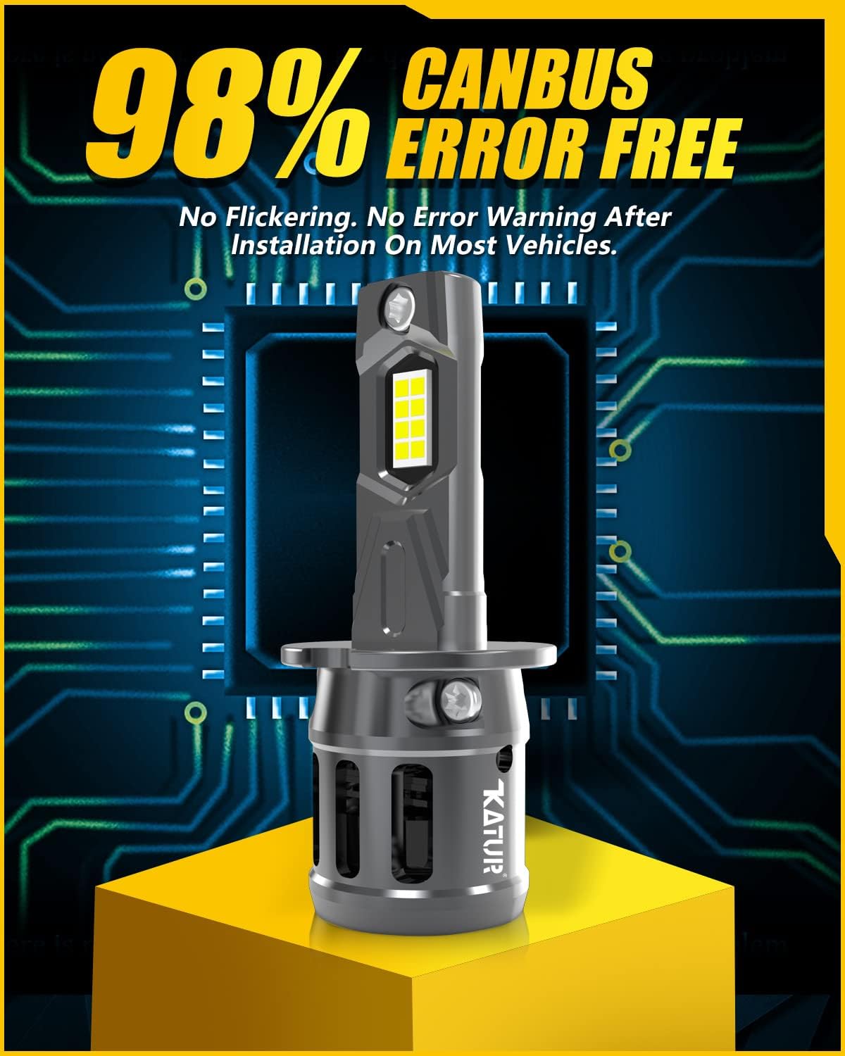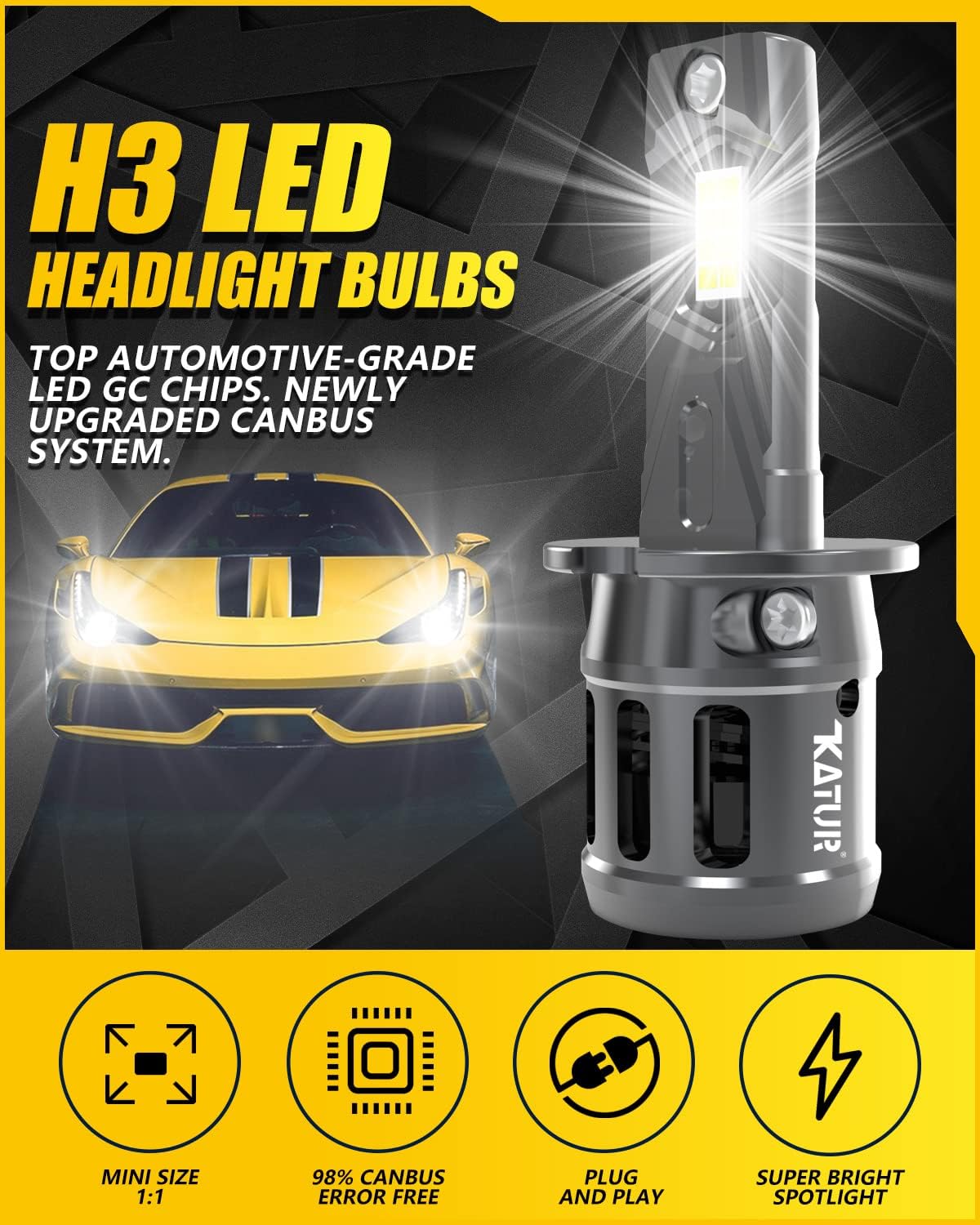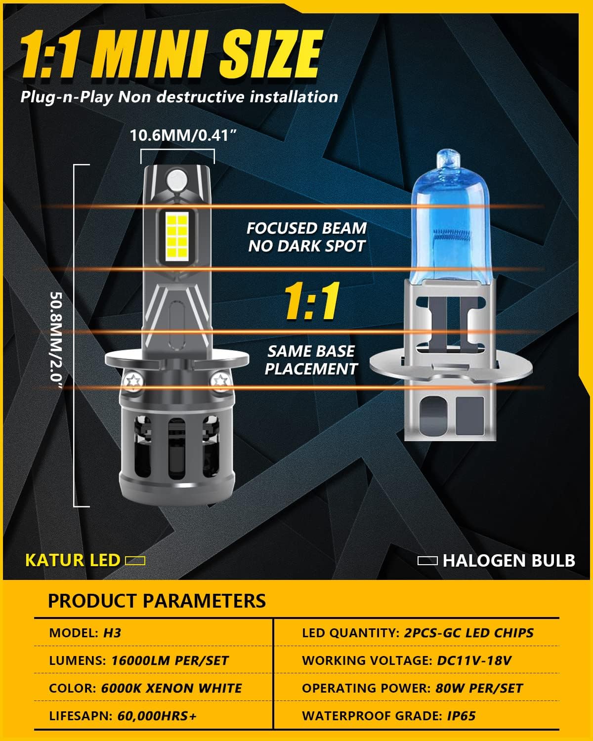 - ★【98% Canbus Compatibility & 1:1 Mini Design】LED H3 headlights use the improved canbus compatible system, compatibility has been greatly improved than other H3 LED bulbs. Almost no electromagnetic interference, don't affect FM radio and walkie-talkie. 1:1 All-in-one mini design, just take out the halogen H3 bulb, insert the canbus error free H3 led headlight bulbs directly. Simple 5 minutes to install KATUR H3 car headlight bulb without any modification.