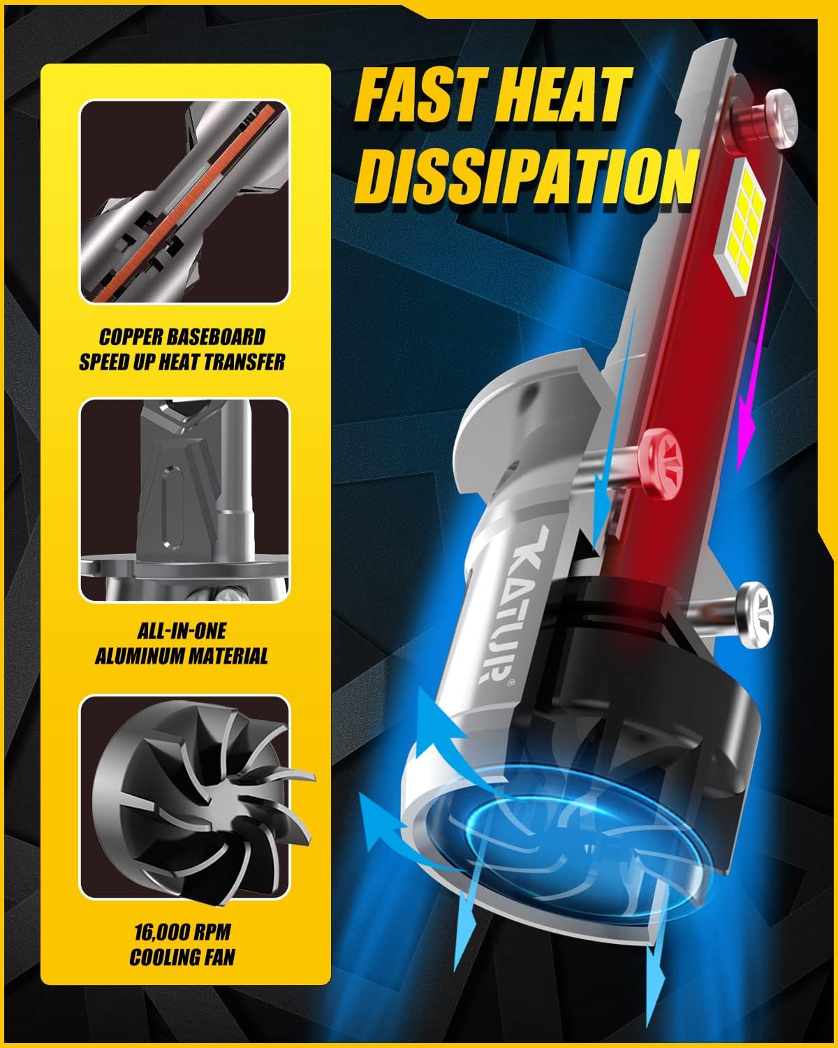 - ★【400% Brightness & Optimal Beam Pattern】KATUR H3 headlight bulbs are 4 X brighter than halogen bulbs for superior night visibility. 1.0mm ultra slim chip pitch and 1:1 beam pattern technology deliver a super-focused light beam that solves the problem of uneven light focus and projects light farther and in a wider radius, increase light efficiency up to 99% and won’t dazzle oncoming traffic.